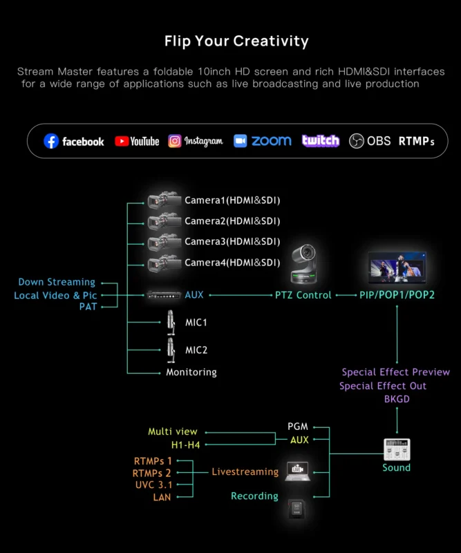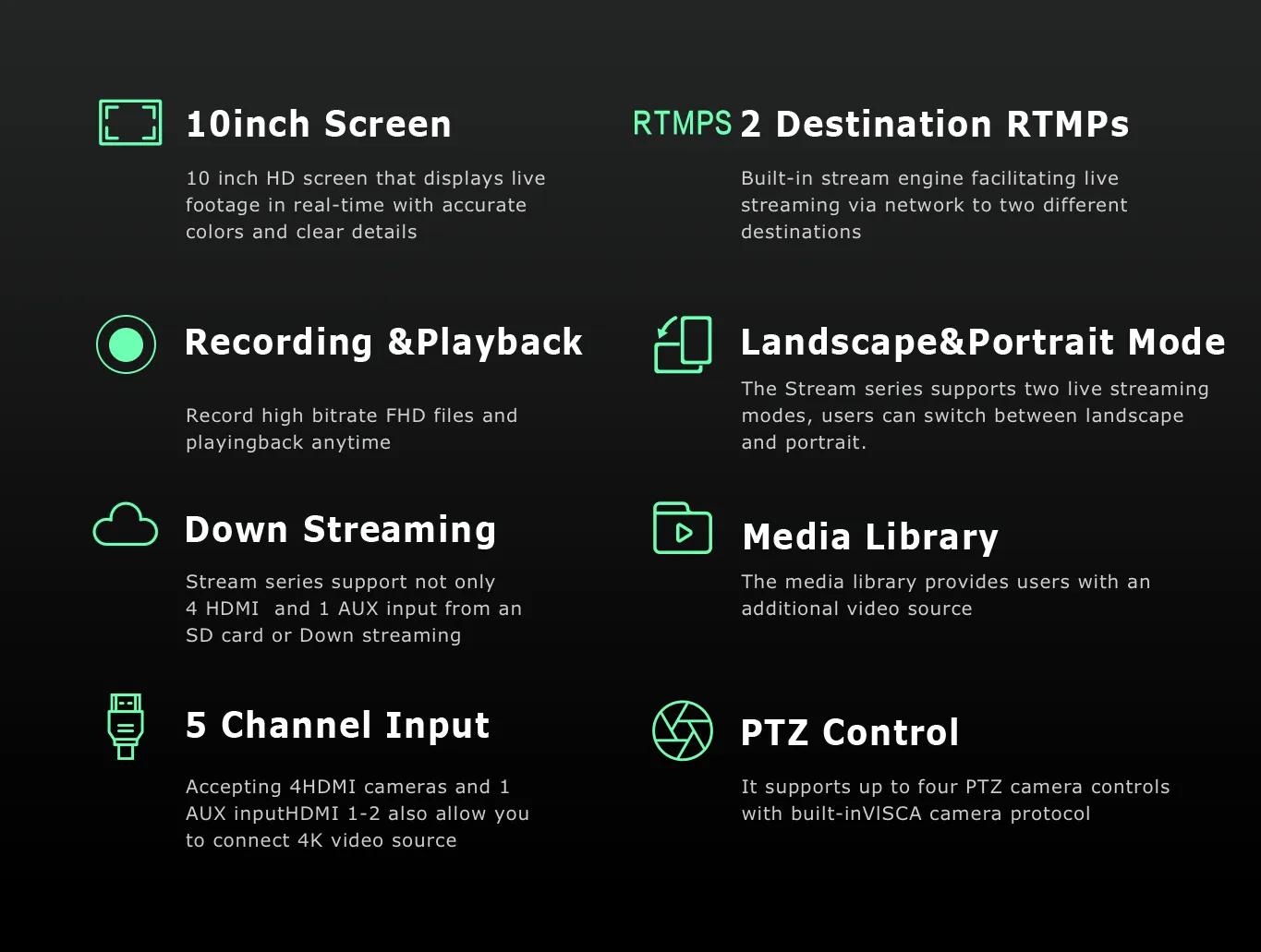 Stream Master คือ Live Streaming Switcher ระดับมืออาชีพที่มาพร้อมหน้าจอ 10 นิ้วความละเอียดสูง รองรับ 4K Input สามารถควบคุมกล้อง PTZ ได้ถึง 4 ตัว และมีฟังก์ชัน Dual RTMP Streaming พร้อมระบบบันทึกและเล่นซ้ำแบบเรียลไทม์