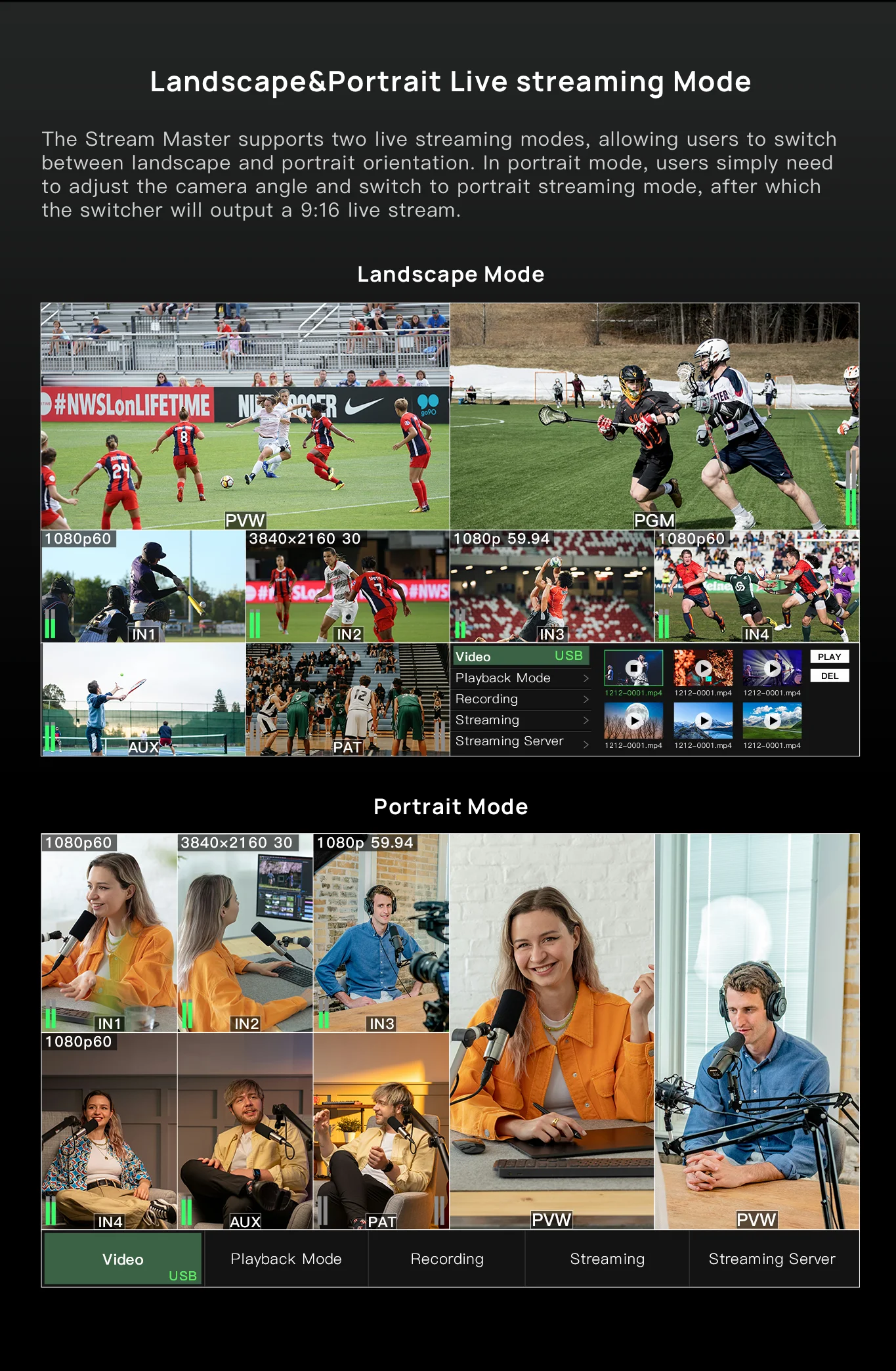 Live Streaming Switcher ที่รองรับทั้งสองโหมดนี้ให้ความยืดหยุ่นสูงสุดในการสร้างคอนเทนต์ คุณสามารถปรับรูปแบบการถ่ายทอดสดให้เหมาะกับแพลตฟอร์มและกลุ่มเป้าหมายของคุณได้อย่างมีประสิทธิภาพ การรองรับโหมด Portrait ทำให้คุณสามารถเข้าถึงผู้ชมบนมือถือที่กำลังเติบโตอย่างรวดเร็ว ซึ่งมักจะใช้เวลากับคอนเทนต์วิดีโอแนวตั้งมากกว่า