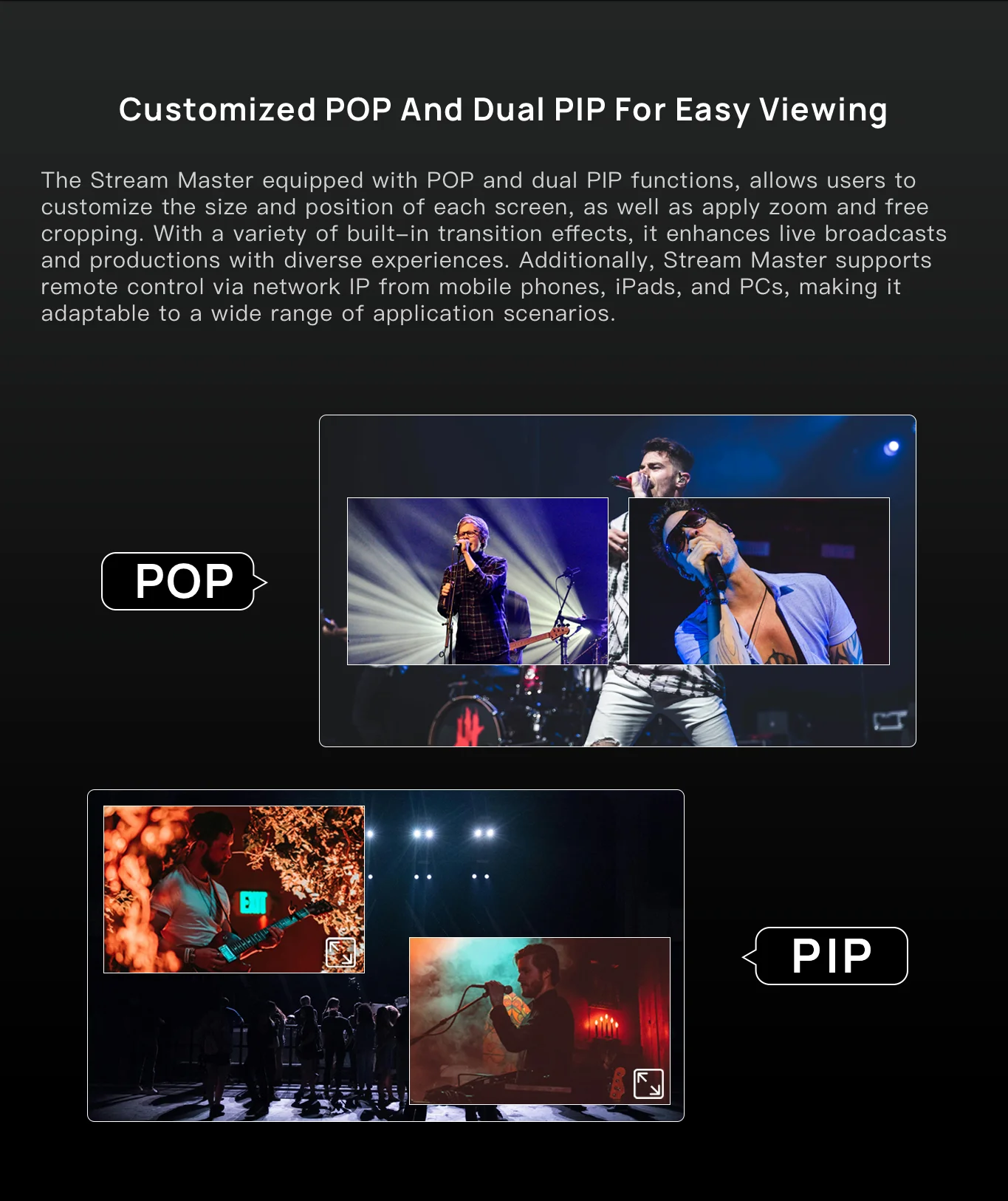 Stream Master รองรับการสร้างเลย์เอาต์ Picture-in-Picture (PIP) และ Picture-on-Picture (POP) ได้ถึง 2 ชั้น โดยสามารถปรับแต่งได้อย่างเต็มที่ คุณสามารถกำหนดขนาด ตำแหน่ง และขอบของแต่ละหน้าต่างได้ตามต้องการ ความสามารถนี้เหมาะสำหรับการทำสัมภาษณ์ การนำเสนอที่ต้องแสดงทั้งผู้นำเสนอและสไลด์พร้อมกัน หรือการแสดงหลายมุมมองของกิจกรรม